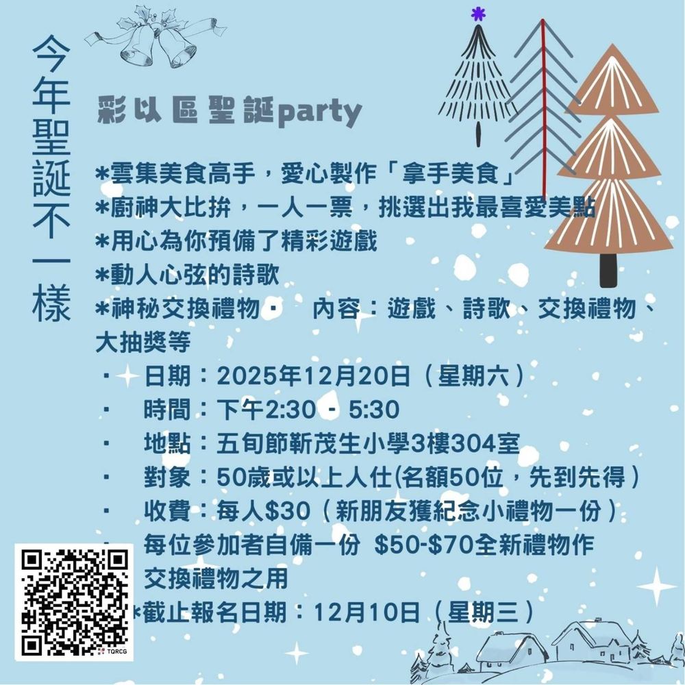 - 備註:每位參加者請自備一份 $50-$70 的全新禮物作交換之用