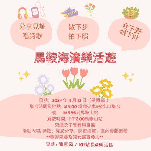 交通及午餐費用自備活動內容: 詩歌、見證分享、閒遊海濱、區內餐館聚餐**歡迎區員及婦女嘉賓參與**查詢:陳素霞 / 101站長@樂活區