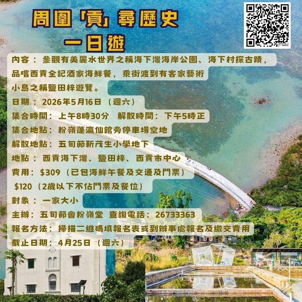 這是一個適合一家大小的活動,不單能欣賞「美麗水世界」的西貢海下灣海岸公園,探訪古蹟海下村,還能在西貢享用豐盛海鮮餐。之後更會乘坐街渡前往充滿客家藝術風情的小島——鹽田梓,感受文化與自然的交融。讓我們一同邀請親友,攜手走進大自然,享受美食與文化,並在旅途中分享主的愛!