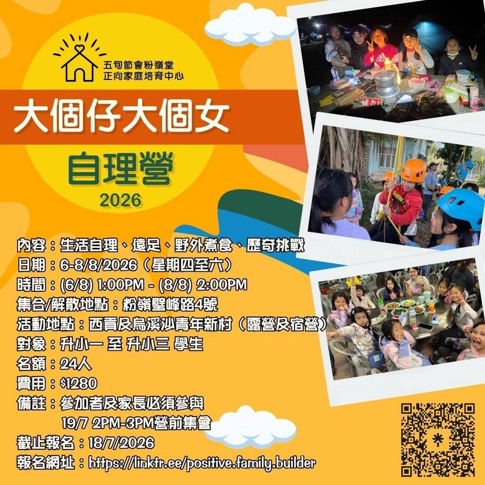 您的孩子準備好迎接獨立的挑戰了嗎?【大個仔大個女自理營2026】結合野外露營與營舍生活,循序漸進讓孩子走出溫室!從搭建帳篷到打理個人起居,由專業社工及歷奇教練團隊全程引導,在安全環境下激發孩子的解難能力與自信。給孩子三天兩夜,還你一個懂事獨立的「大個仔大個女」!