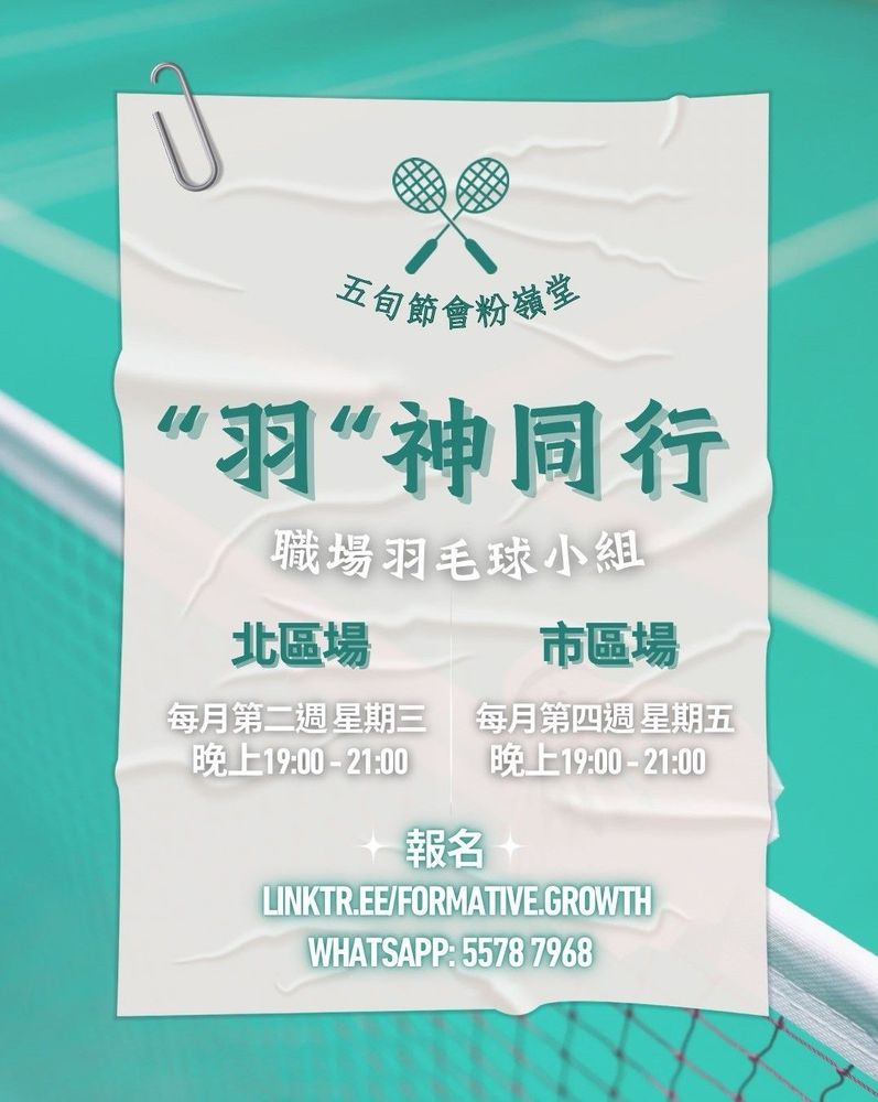 收費:每月$50(包括場租及球費)頻率:每月兩次適合對象:所有職場弟兄姊妹及社區朋友(歡迎邀請同事一齊嚟!)