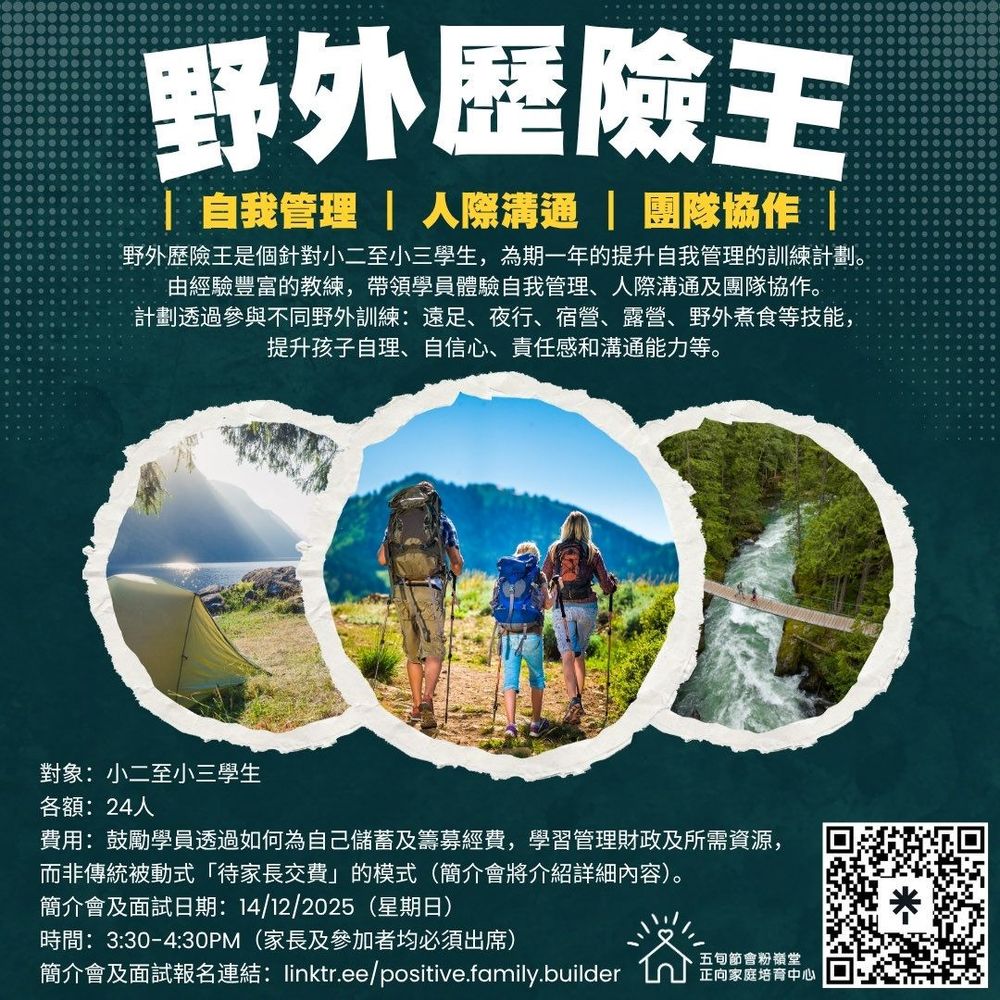 野外歷險王是個針對小二至小三學生,為期一年的提升自我管理的訓練計劃。