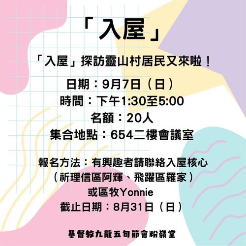 日期及時間:9月7日(日),下午1:30至5:00名額:20人集合地點:654二樓會議室報名方法:有興趣者請聯絡入屋核心(祈理信區阿輝、飛躍區羅家)或區牧Yonnie 截止日期:8月31日(日)